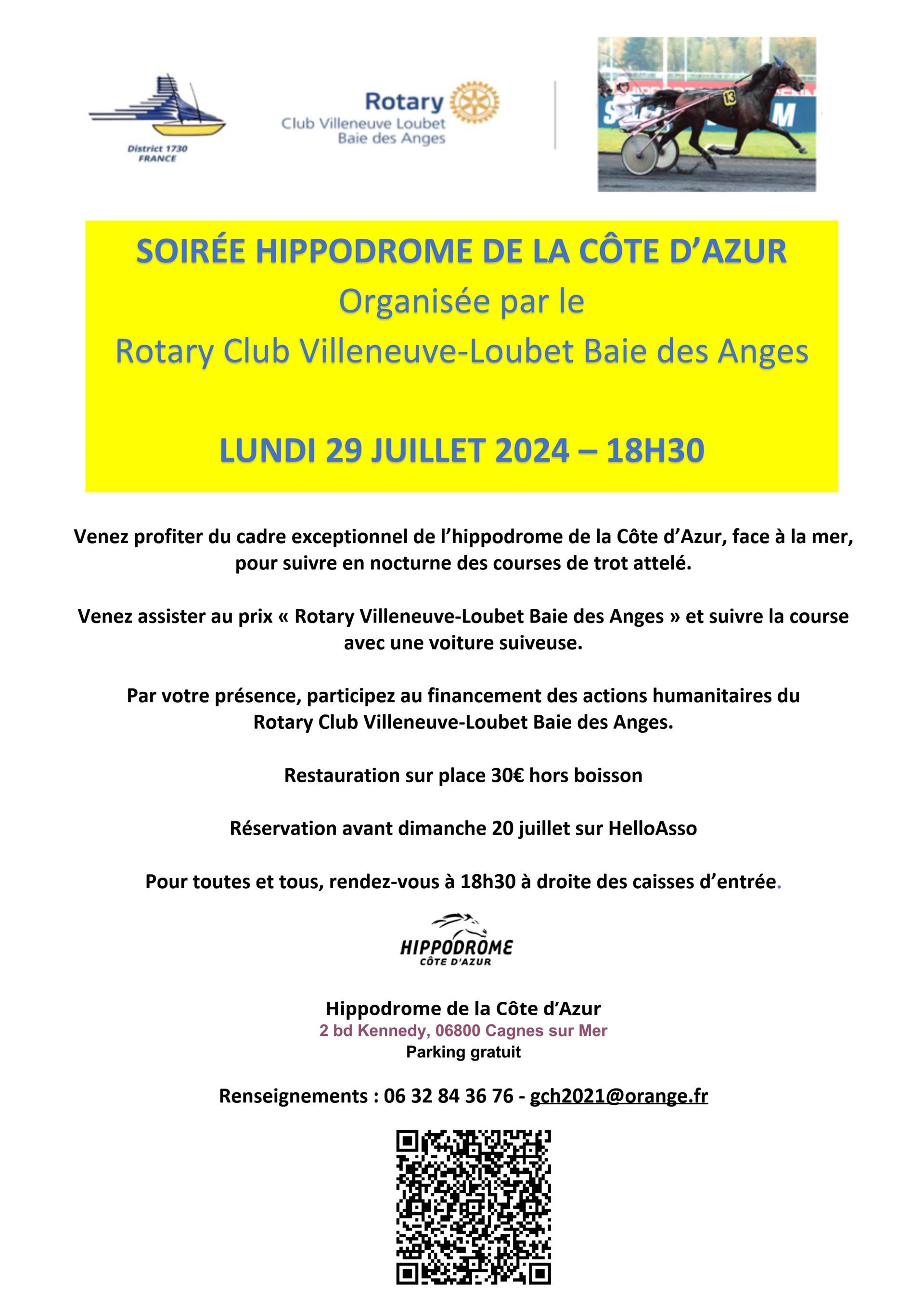 Réservation avant le 20 juillet sur Helloasso: https://www.helloasso.com/associations/rotary-club-villeneuve-loubet-baie-des-anges/evenements/soiree-hippodrome-de-la-cote-d-azur-lundi-29-juillet-2024