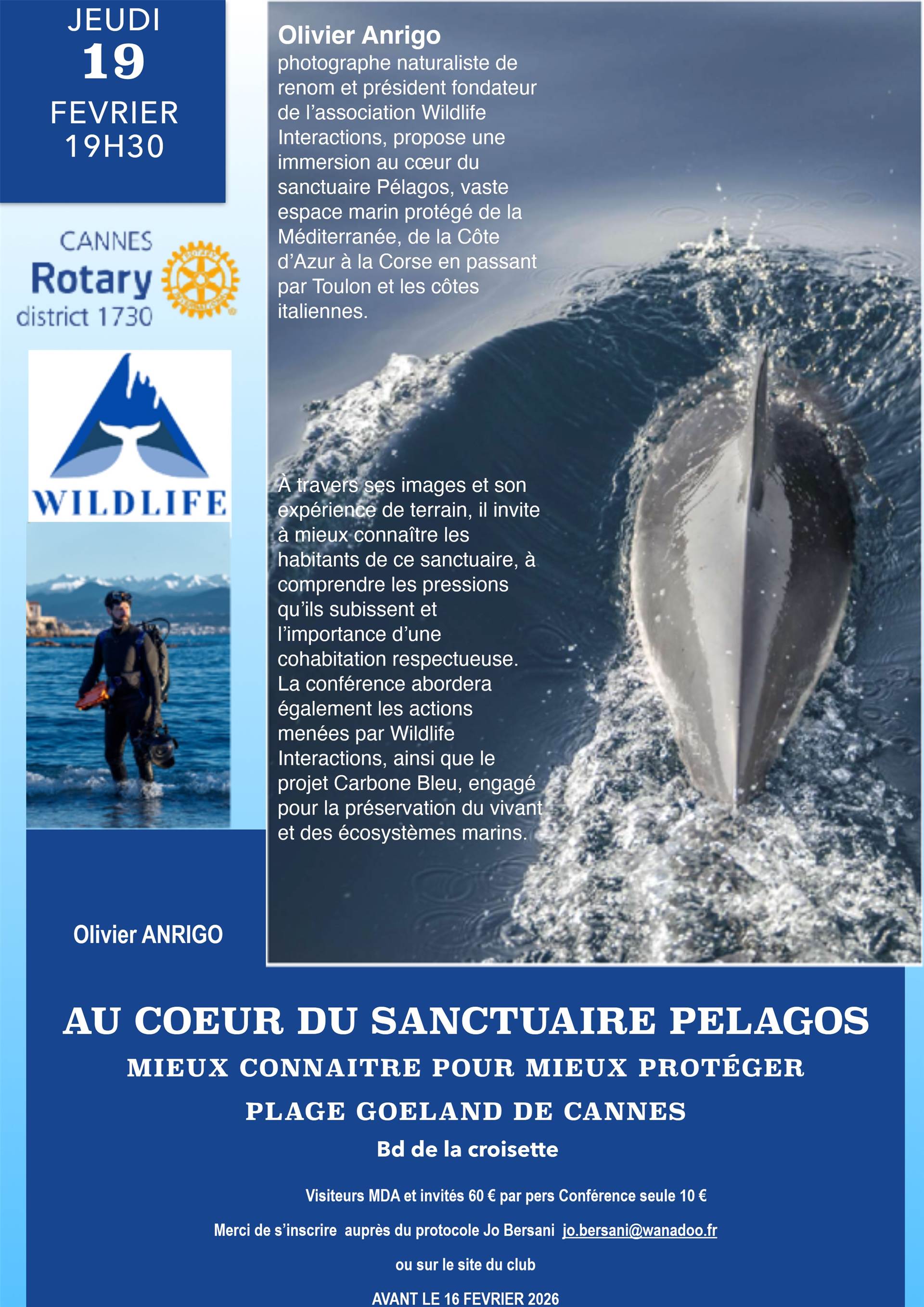 À travers le regard d’Olivier Anrigo, photographe naturaliste de renom et président fondateur de l’association Wildlife Interactions, cette conférence propose une immersion au cœur du sanctuaire Pélagos, vaste espace marin protégé qui s’étend le long de notre littoral méditerranéen, de la Côte d’Azur jusqu’à la Corse, en passant par Toulon et les côtes italiennes, notamment Florence.